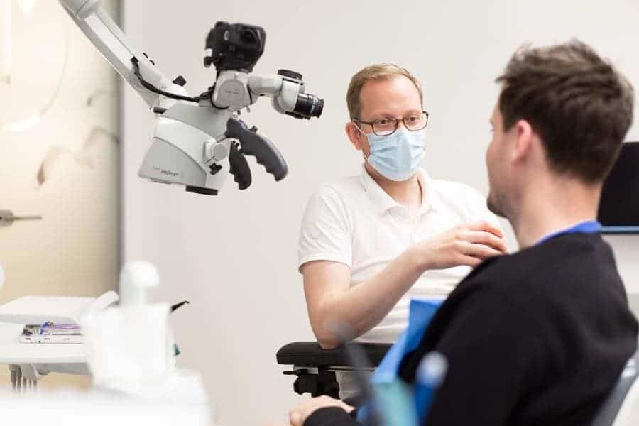 Eine der modernsten Behandlungsformen in unserer Zahnarztpraxis ist die mikroskopische Wurzelkanalbehandlung. Diese Behandlungsform ermöglicht es dem Zahnarzt, Wurzelkanäle präzise und gründlich zu reinigen sowie Entzündungen und Schmerzen zu lindern. Mithilfe des operativen Mikroskops können die Wurzelkanäle in hoher Vergrößerung betrachtet und versteckte oder schwer zugängliche Bereiche entdeckt werden. Dies ermöglicht es Ihnen eine effektive und sichere Behandlung zu bieten. Wenn Sie an einer mikroskopischen Wurzelkanalbehandlung interessiert sind, bespricht unser Zahnarzt in Kiel gerne individuell mit Ihnen die Möglichkeiten.